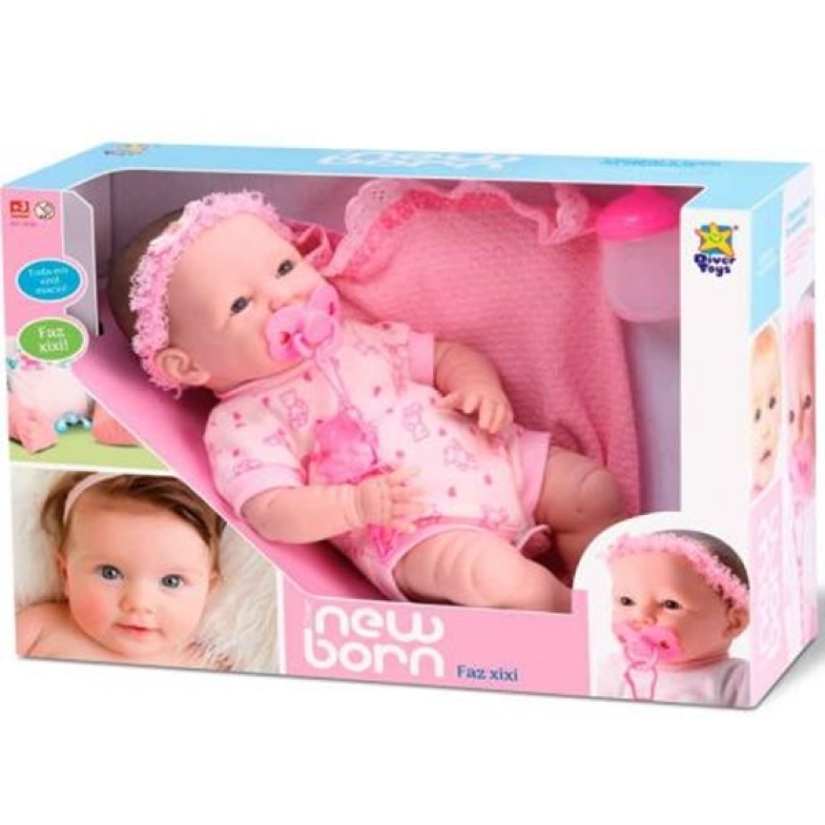 A nova boneca Diver New Born Faz Xixi é um lindo bebê que acompanha uma mantinha super fofa e delicada, uma mamadeira, chupetinha e fraldinha, e esta a espera de seus cuidados. Dê a mamadeira para a sua bebê e ele faz xixi. A boneca tem o corpo macio e é produzida em vinil.