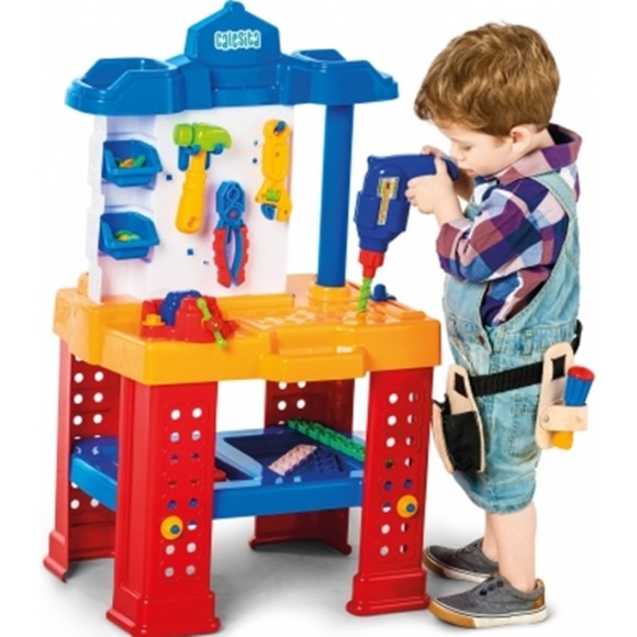 Uma bancada com duas frentes de trabalho colorida e equipada com muitas ferramentas e acessórios! A brincadeira será montar e desmontar, parafusar e soltar parafusos e o que mais a imaginação quiser!
